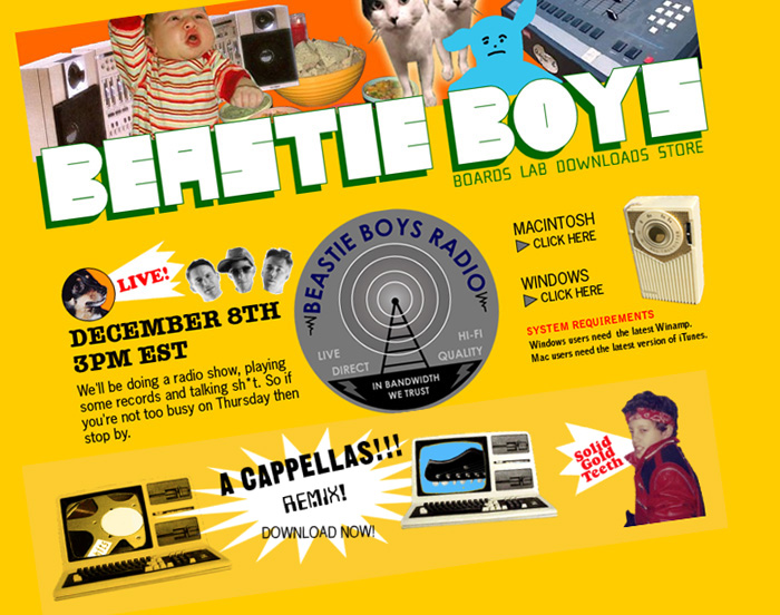 I worked with the Beastie Boys on various projects between 2004 and 2007 designing main websites as well working with the group in developing the Beastie Boys Radio show and A Cappellas Remix project. I also worked on the website for their movie, Awesome, I Fuckin’ Shot That!.